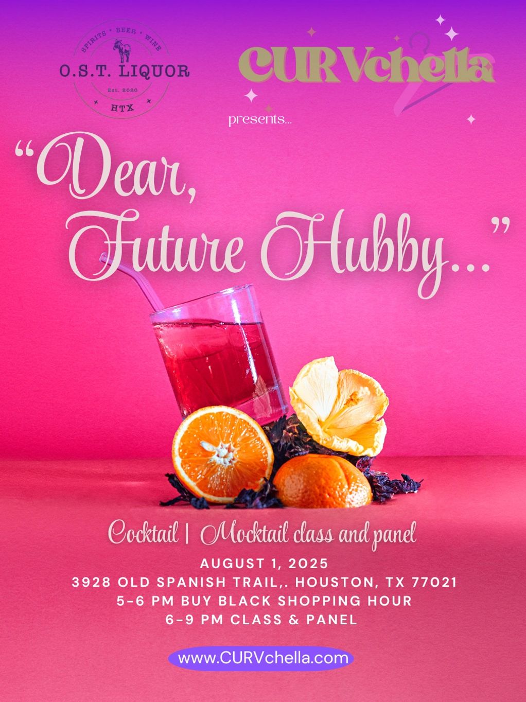 Our community partner, black-owned OST Liquor is hosting the women of CURVchella for a cocktail/mocktail class and a panel entitled “Dear Future Hubby…”. Light bites will be served!